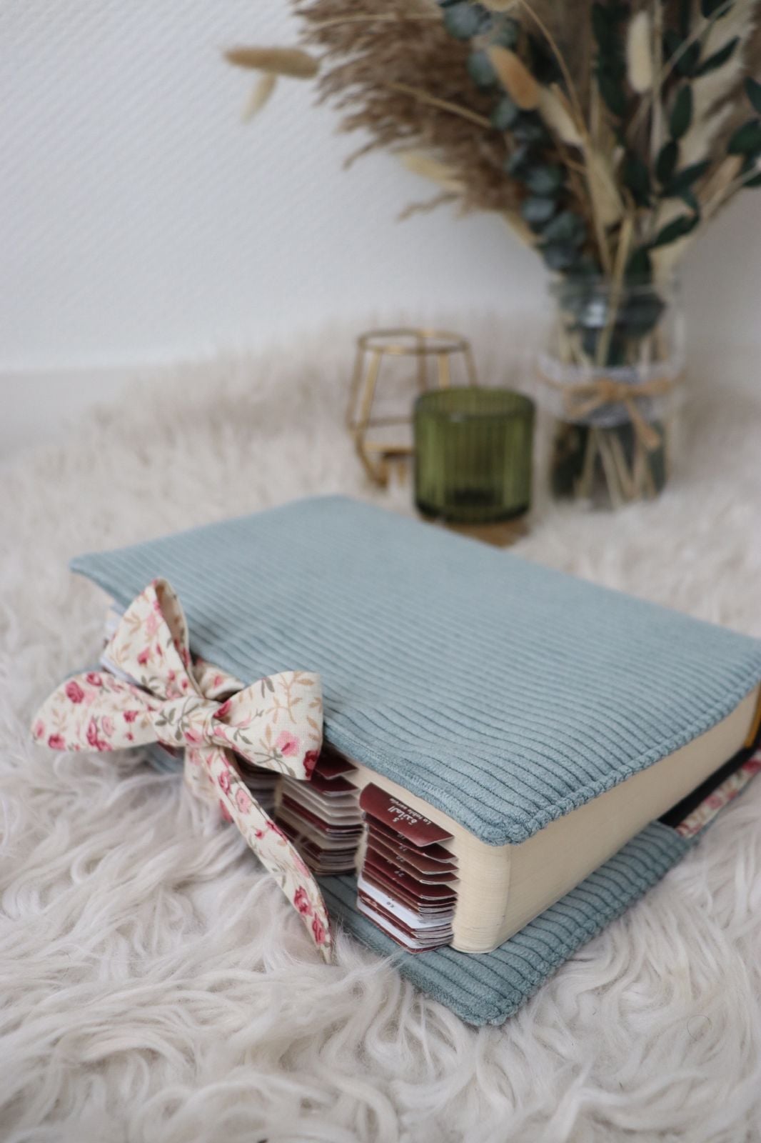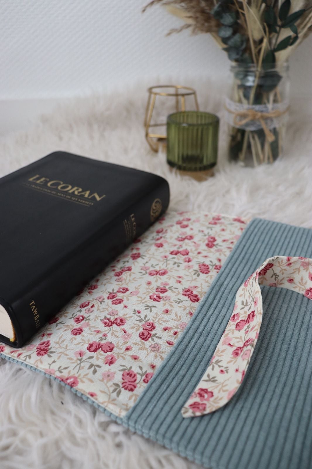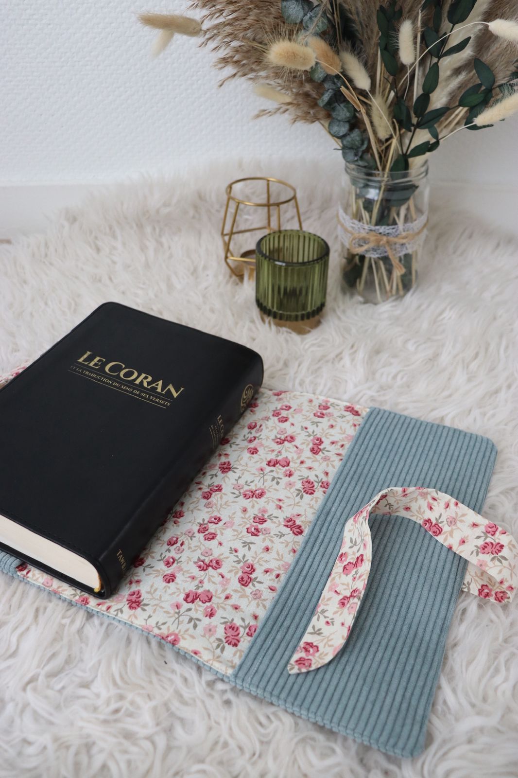 Protège-Coran confectionné à la main en velours côtelé, doublé d’un tissu en coton, pour une protection douce et élégante.